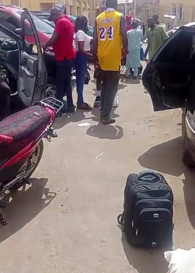 The video depicts a street scene with several individuals and vehicles. There are multiple cars parked, and their doors are open. Some people are standing near the cars, engaging in conversations, while others are moving about in the background. One person is wearing a Kobe Bryant jersey, another has a helmet on. A motorcycle with a red mesh seat cover is parked next to one of the cars. A black backpack sits on the ground near the vehicles. The setting appears to be an outdoor parking area or a street lined with buildings. The weather seems sunny, and the general activity level is moderate.