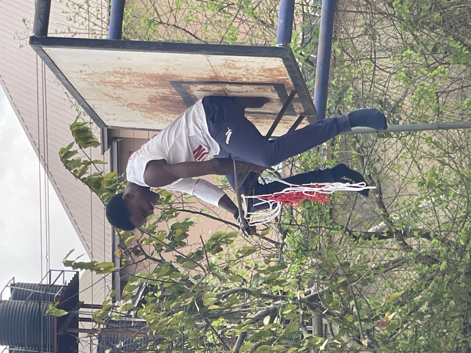 In Okigwe, Nigeria, a young adult male is depicted straddling a basketball rim in an outdoor setting