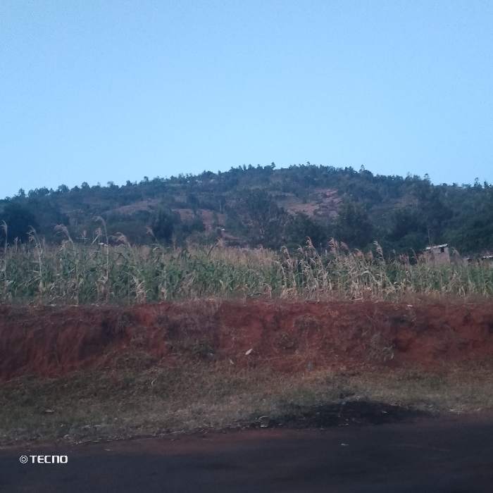 A serene landscape features a cultivated field of tall corn stalks in the foreground. Behind the field, a vibrant red-brown embankment provides a striking contrast. A hillside covered with lush trees and vegetation forms a natural backdrop against a clear, blue sky. The scene evokes a sense of tranquility and rural beauty.
