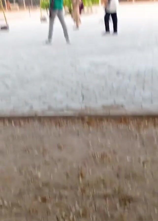 A video shows a group of people playing badminton on a paved court