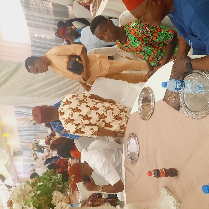 group of people gathered around a table in a brightly lit hall in Gwapan, Nigeria, located at latitude 9.908, longitude 8.96. There is a man wearing a red cap and a cream-colored shirt with a brown deer pattern, standing behind the table. He is looking down at the table. A man in a white shirt and a man in a blue shirt are seated at the table. The man in the white shirt is talking on his phone and has his head down. The man in the blue shirt has his back to the camera. There is a blue bottle of water and a brown can of soda on the table. In the background, a man in a tan shirt and a woman in a red dress are standing and talking. There is a bouquet of white flowers in the foreground of the image. The location appears to be a wedding or party celebration.