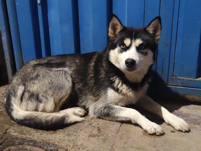 - "A husky with striking blue eyes lies on a concrete surface against a blue metal backdrop" by FM-20kwN2, licensed under CC BY 4.0
