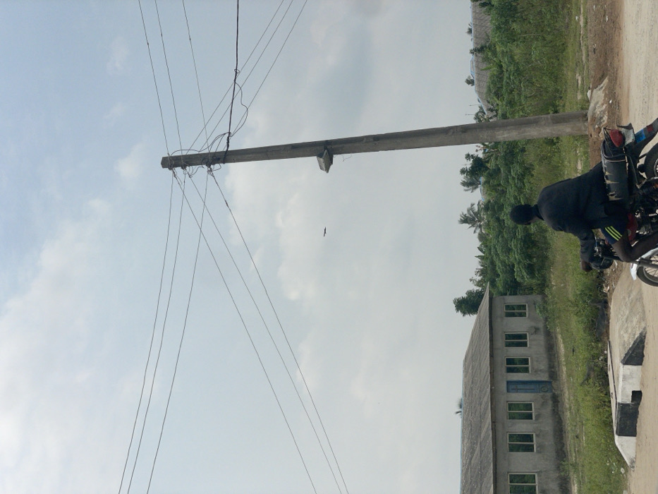 The image depicts a semi-urban or rural street scene in Itoga, Nigeria, under an overcast sky. In the foreground, a dark-colored motorcycle is positioned on a dirt path, facing away from the camera. A male individual, wearing a dark jacket and dark shorts with a light stripe, is seated on the motorcycle. A concrete speed bump, painted with black and white stripes, is visible on the ground to the lower left. In the midground, to the left, stands a single-story building with light grey walls and a grey corrugated roof. It features multiple rectangular windows with reflective surfaces and a prominent blue door. To the right, a tall, grey concrete utility pole rises, supporting numerous overhead power lines connected at various points, and a single street light fixture is attached. The background consists of dense green vegetation, including bushes and several palm trees, stretching across the frame behind the building and the utility pole. Partially visible through and above the foliage on the far right are distant structures with thatched roofs. A small, dark, winged object, likely a bird, is visible in flight in the upper mid-sky. The ground consists of dirt and sparse grass.