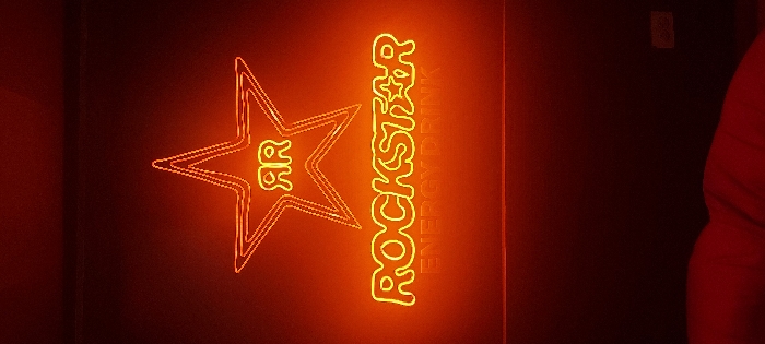 - "An illuminated orange-yellow neon sign displaying the "Rockstar Energy Drink" logo is the central subject of this vertical image" by FM-Fzicx2, licensed under CC BY 4.0