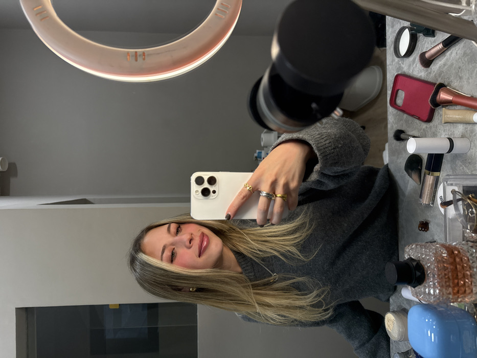 An image captured via a mirror reflection depicts a young female taking a selfie indoors. The specific location within Monterrey, Mexico, cannot be determined from the visual information provided. **Subject and Action:** A light-skinned female with long, blonde-highlighted hair, wearing a gray knit sweater, gold stud earrings, a silver necklace, and multiple rings on her right hand, is holding a light-colored smartphone (equipped with a triple-lens camera array) to capture her own reflection. She is smiling subtly with light makeup applied to her face, including blush and lip gloss. **Environment and Objects:** The female stands before a mirror reflecting an indoor setting, likely a room with light gray walls. A vanity surface or tabletop in the foreground is cluttered with various cosmetic items. These include multiple makeup brushes, a red smartphone case, a large faceted perfume bottle (appearing to be Valentino), a blue container, several tubes and compacts of makeup (e.g., lipstick, powder, foundation), and a small brown hair clip. To the right, a large circular LED ring light, mounted on a stand, is visible, emitting a glow that illuminates the scene. The reflection of a white, possibly ceramic, object is also visible in the background, behind the ring light.