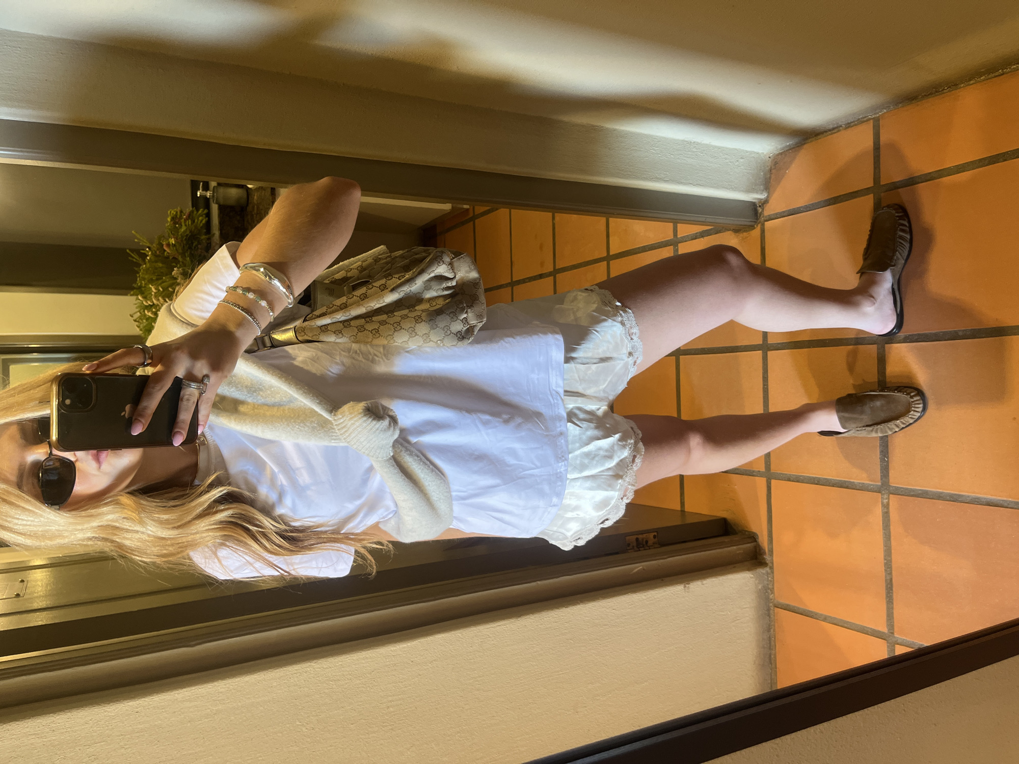 A person with long blonde hair is taking a selfie in a mirror. They are wearing sunglasses, a white t-shirt, white shorts with lace trim, a light beige sweater, and brown moccasins. They have silver bracelets and rings on their hand that is holding the phone. A patterned purse is hanging from their shoulder. The flooring is terra-cotta tile. The location cannot be determined from the image.
