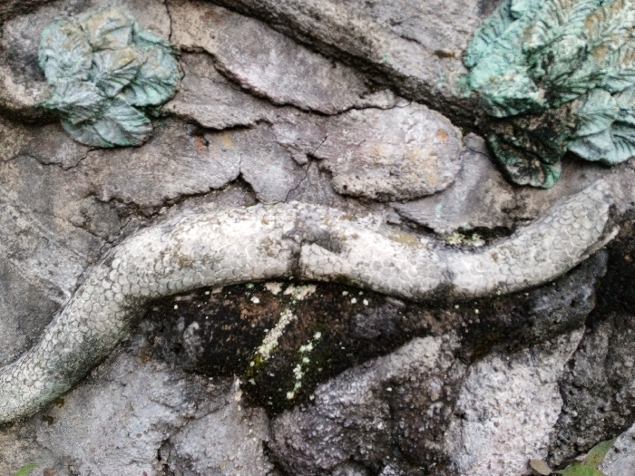 This image displays a close-up view of a weathered bas-relief sculpture located in Batheay, Cambodia. The central subject is a light grey, serpentine form, approximately centered horizontally, exhibiting distinct scale patterns along its length. This serpentine element is integrated into a darker, rough-textured background surface, likely concrete or stone, which displays irregular contours and several visible cracks. In the upper left and upper right quadrants, two stylized floral or leafy relief carvings are visible, rendered in a greenish-blue hue consistent with an oxidized metal patina. Patches of dark green and white moss or lichen growth are present on the darker textured surface, particularly below the serpentine form, indicating prolonged environmental exposure. No human figures or active interactions are depicted.