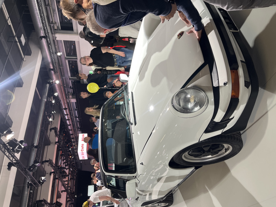 The image displays an indoor exhibition at Messe Zürich in Oerlikon, Zurich, Switzerland. A white classic Porsche 911 Targa is centrally featured on a light, reflective floor. The vehicle has a black roll bar, a black removable roof panel, and black multi-spoke wheels with silver outer rims. Its front bumper is black with integrated amber turn signals and bumperettes. A man in a dark blue long-sleeved shirt is leaning over the car's front hood on the right, his hands positioned near the Porsche crest. In the mid-ground, a crowd of spectators is visible. This includes a blonde woman in a black top, a man in a black shirt holding a yellow balloon, another man, and a woman in a black t-shirt and blue jeans with glasses. Two children are partially visible below the man with the balloon. To the far left, a man in a white t-shirt and a yellow beanie is partially visible. The overhead environment features exposed metal trusses, multiple track lighting fixtures, and ventilation ducts. In the background, a sign displaying "Café Blick Café Blick" in red text on a white background is visible.