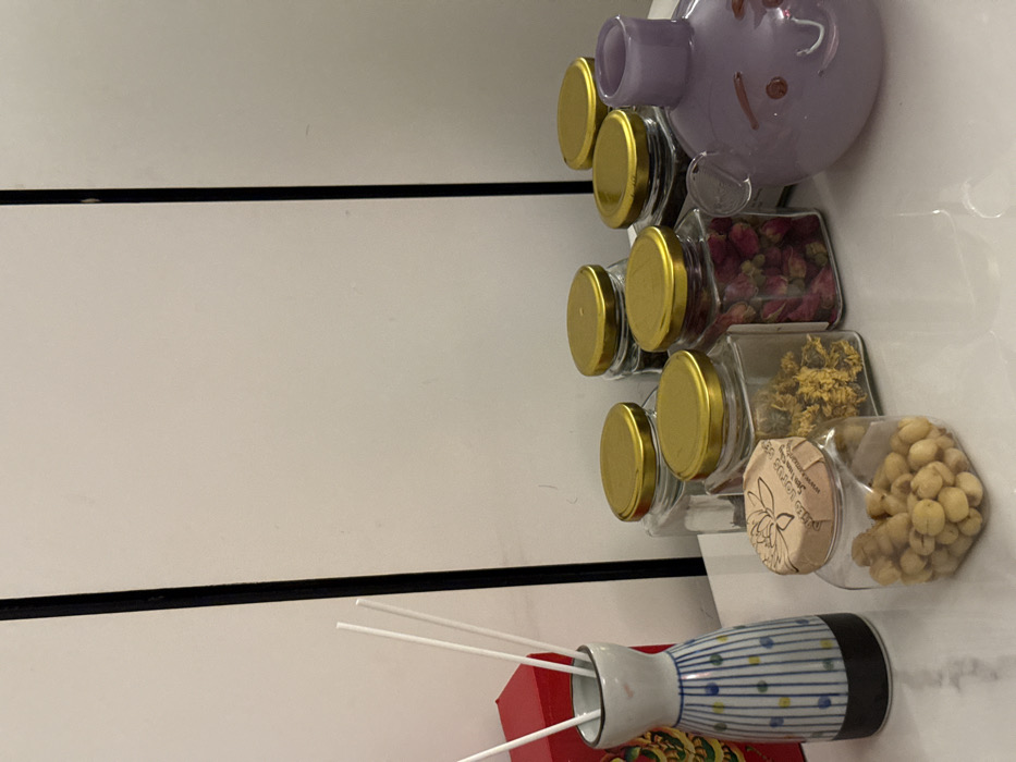 This image depicts an indoor setting, specifically a collection of items arranged on a white, reflective surface against a plain white wall, located in Ho Chi Minh City, Vietnam. The scene features an assortment of jars and decorative objects. On the far left, a ceramic diffuser vase, approximately 15 cm tall, with horizontal blue stripes on a white background and a dark brown base, holds three slender white diffuser sticks. Behind this vase, a portion of a red box adorned with gold ornate patterns is visible. In the foreground, slightly to the right of the diffuser, a clear square glass jar with a brown paper lid, labeled "Wild Lotus Seeds," contains numerous light-colored, oval-shaped dried lotus seeds. Behind this front jar and extending to the right, a cluster of at least seven other clear square glass jars with gold-colored screw-on lids are arranged. One jar, immediately behind the lotus seed jar, contains dried yellow flowers, possibly chrysanthemum. Another jar, further to the right, is filled with dried pink/red rosebuds. The remaining jars, positioned in the background, contain darker, indistinct dried contents. On the far right, a translucent purple glass decorative object, approximately 15 cm tall, with a rounded base and a stylized face or character design, including two small ears and etched facial features (eyes, nose, mouth), stands beside the array of jars. A vertical black line, possibly a door frame or furniture edge, runs from the top to the bottom of the image behind the objects. The lighting appears uniform, suggesting an interior space. No individuals are present, and no actions or interactions are occurring.