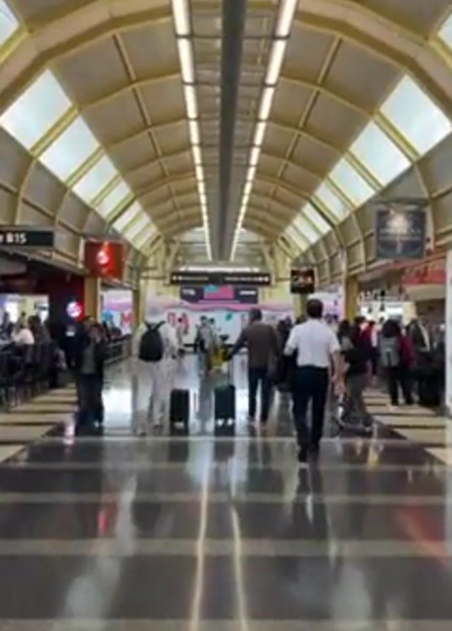 interior of an airport terminal or walkway. Several people are walking in both directions along a polished floor. Many are pulling luggage behind them. The structure overhead is arched with rows of rectangular lights. On either side of the walkway are storefronts or areas with seating. Signs indicating gate information are visible above the people.