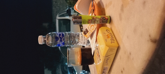 A water bottle lies horizontally next to a layered drink in a square glass. A yellow lighter with a cartoon design and a packet of Camel cigarettes are also present. A small, tan, square item is positioned between the lighter and the cigarettes. The scene is set on a light surface, possibly a table, with a partial view of a car in the background.