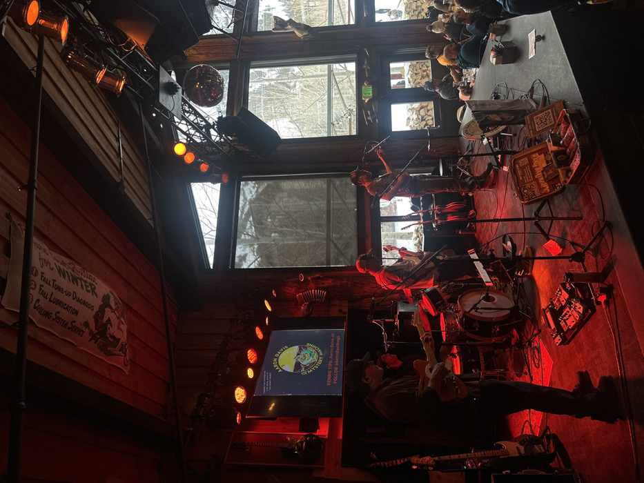 A live band performs in a dimly lit, rustic venue with exposed wooden beams and large windows