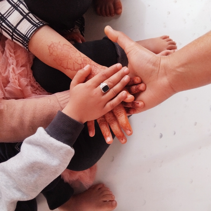 The image captures a close-up, top-down perspective of five human hands, belonging to at least five individuals, stacked vertically. The scene is situated in Lassan, Pakistan. The hands rest on a plain, light-colored surface, possibly white, which exhibits faint dark speckles. From the bottom of the stack: 1. An adult-sized, light-skinned hand is positioned with its palm facing upwards, forming the lowest layer. 2. Resting directly upon it is a smaller hand, palm down, displaying reddish-brown henna staining across its digits and palm. 3. Superimposed on this is a child-sized hand, also palm down, featuring a silver-toned ring with a black, square-cut stone on its ring finger. 4. A partial limb, identified as belonging to a child, is visible at the upper left, wearing a grey long-sleeved top with a dark cuff and black trousers. This limb's hand is part of the stack. 5. Another partial limb, also identified as belonging to a child, is visible at the upper right. It wears a black and white plaid patterned sleeve and displays an intricate reddish-brown henna design on the forearm. A pink ruffled garment and dark trousers are partially visible beneath this limb. Bare feet are discernible at the extreme left and right margins of the frame. The hands are positioned in a deliberate, overlapping stack.