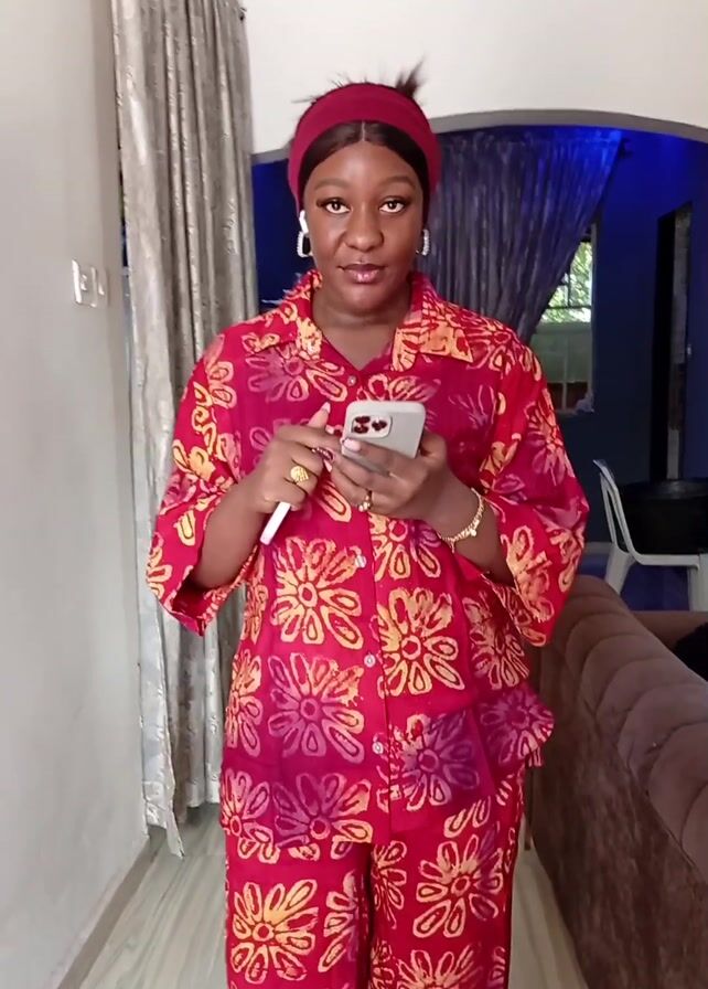A woman is standing in what appears to be a hallway, looking at her phone. She is wearing a matching red pajama set with a floral pattern and a red headband. She has wireless earbuds in her ears and is wearing gold jewelry on her fingers and wrist. She is holding a pen in her other hand. The hallway has light-colored walls and tiled floors. A curtain is visible on the left side of the frame, and a glimpse of a living room with a couch and blue lighting can be seen through an archway in the background. The woman looks up from her phone, makes a kissing face, and then looks back at her phone.