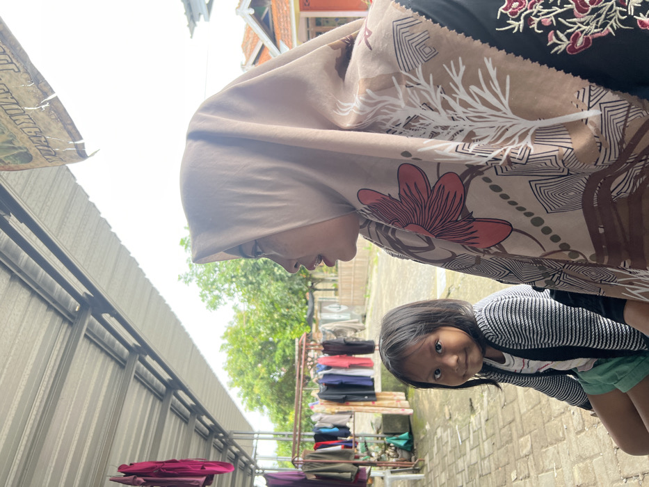 This image captures a candid daytime scene in Wedarijaksa, Indonesia, featuring two individuals under a corrugated metal awning