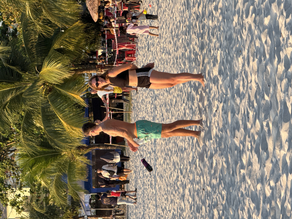 The scene depicts a late afternoon at Cenang Beach, Malaysia, characterized by golden hour lighting. In the foreground, two individuals stand barefoot on light-colored sand. A Caucasian male, viewed in profile, stands on the left. He is shirtless, with visible tattoos on his left arm and torso, and wears light teal swim trunks with a subtle pattern. He holds a white towel and a dark-colored bottle in his left hand. To his right, a Caucasian female faces slightly left, wearing a black crop top, black shorts with white side stripes, and dark sunglasses. Her hands are clasped behind her back. In the mid-ground and background, the beach transitions into areas with activity and structures. To the left, under a blue and white canopy, several individuals are visible, including some wearing head coverings. To the right, an outdoor beachside dining or bar area is set up with numerous red tables and chairs, some under a thatched umbrella. Multiple people are seated and standing in this area, interacting. Two small children are visible in front of this area, with one child in a pink outfit playing with a yellow bucket in the sand. Tall palm trees with green fronds dominate the background, casting long shadows. The overall environment is a sandy beach illuminated by warm, low-angle sunlight.