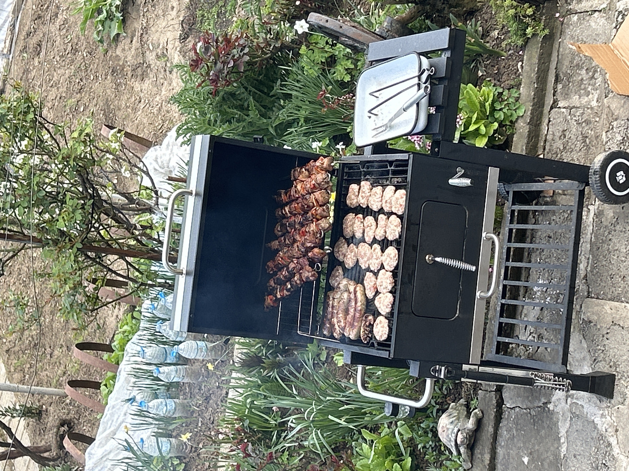 black charcoal grill outdoors, likely in a yard. The grill is loaded with various meats: skewers on the left and rows of what appear to be sausages and burger patties on the right. The setting appears to be residential, with plants and stone paving visible in the background. There are water bottles and gardening tools. The location is in the city of Bukovlak, Bulgaria. There are no people visible in the frame.
