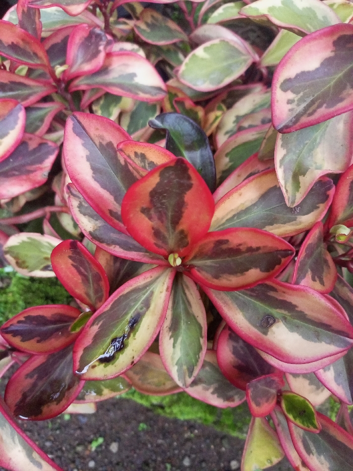 A close-up, high-angle view captures a dense cluster of variegated broadleaf plants, located in Bamhori, India. The foliage, possibly a species of Peperomia or similar, consists of numerous ovate to lanceolate leaves displaying a blend of vibrant reds, pinks, dark greens, and pale yellow/cream, often with reddish margins and mottled central patterns. The leaf surfaces appear waxy, and several leaves exhibit visible water droplets, particularly on the lower-left portion of the frame where a distinct dark streak of liquid is present on one leaf. The plant growth is dense and clustered, with some leaves arranged in rosette patterns. Dark, moist soil and patches of green, moss-like vegetation are visible in the blurred background, indicating a ground-level or potted plant setting. No people, animals, or artificial objects are present.