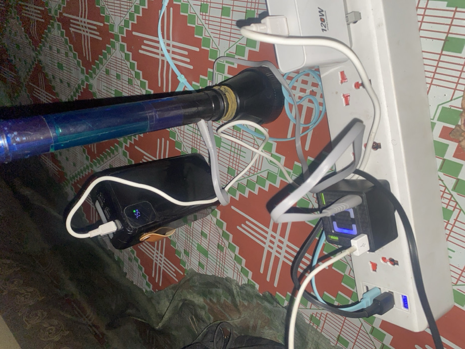 An overhead shot reveals a cluttered scene of electronics plugged into a white power strip. A blue-wrapped flashlight rests near a black power bank displaying a 75% charge. Numerous white and gray charging cables intertwine with the devices. The power strip is overloaded with adapters and cables, including a 120W adapter. The background showcases a patterned surface.