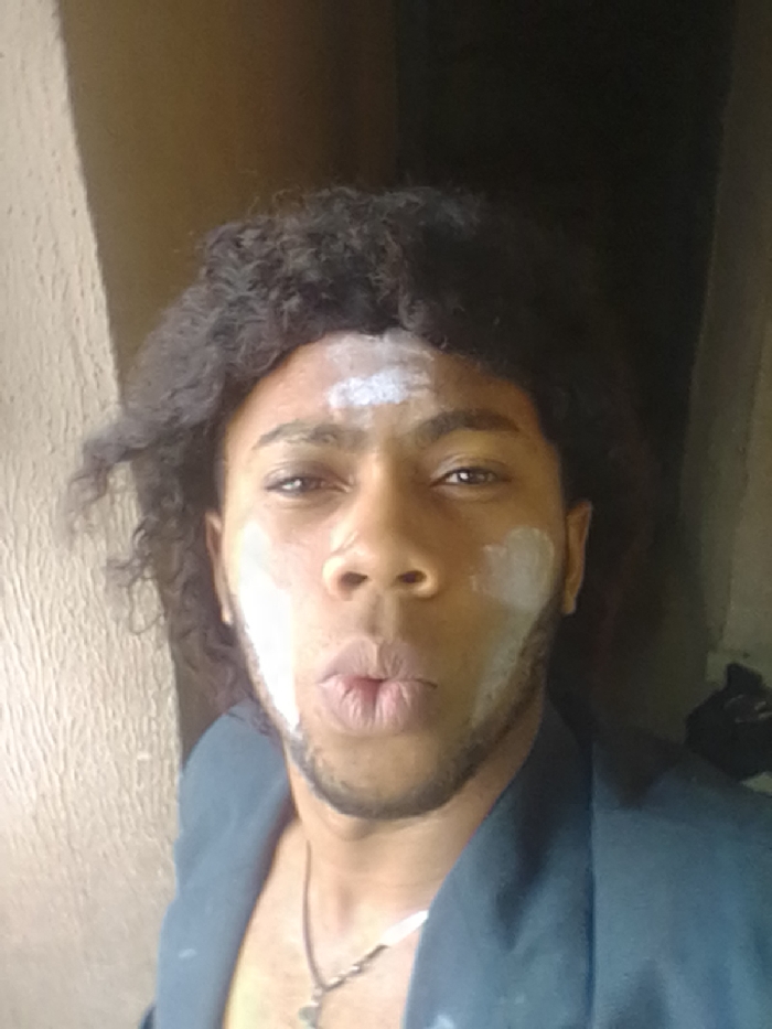 A male individual with dark, curly hair and a short beard is depicted in a close-up, forward-facing shot, likely a selfie, taken in Onitsha, Nigeria. He has white markings applied to his face: a horizontal band across his forehead and two irregular patches on each cheek. His lips are pursed forward. He is wearing a dark, unbuttoned collared garment, revealing his upper chest and a necklace with a light-colored pendant. The background consists of a light-colored, textured wall on the left and a dark, indistinct area to the right, suggesting an indoor or shadowed outdoor setting.