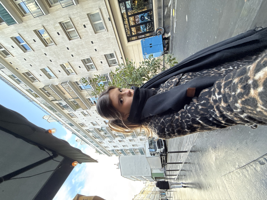 The image depicts a young female subject standing on a wet urban street in Paris, France. She is positioned in the foreground, wearing a leopard-print coat and a black scarf with a small brown rectangular tag, her light brown hair tied in a ponytail. Her gaze is directed towards the camera. Above her, a dark awning with two exposed, orange-tinted lightbulbs is visible. The street surface appears wet, suggesting recent precipitation, and is lined with black bollards. In the mid-ground, a multi-story building with a light-colored facade, numerous windows, and several balconies with black railings rises under a partly cloudy sky. To the subject's left, further down the street, a second individual walks away from the camera, and a white box truck is visible. To the subject's right, a blue cargo bicycle with a large blue storage box is parked against the curb, in front of a storefront featuring dark glass and decorative metal grilles. A small tree with green foliage is situated behind the primary subject.