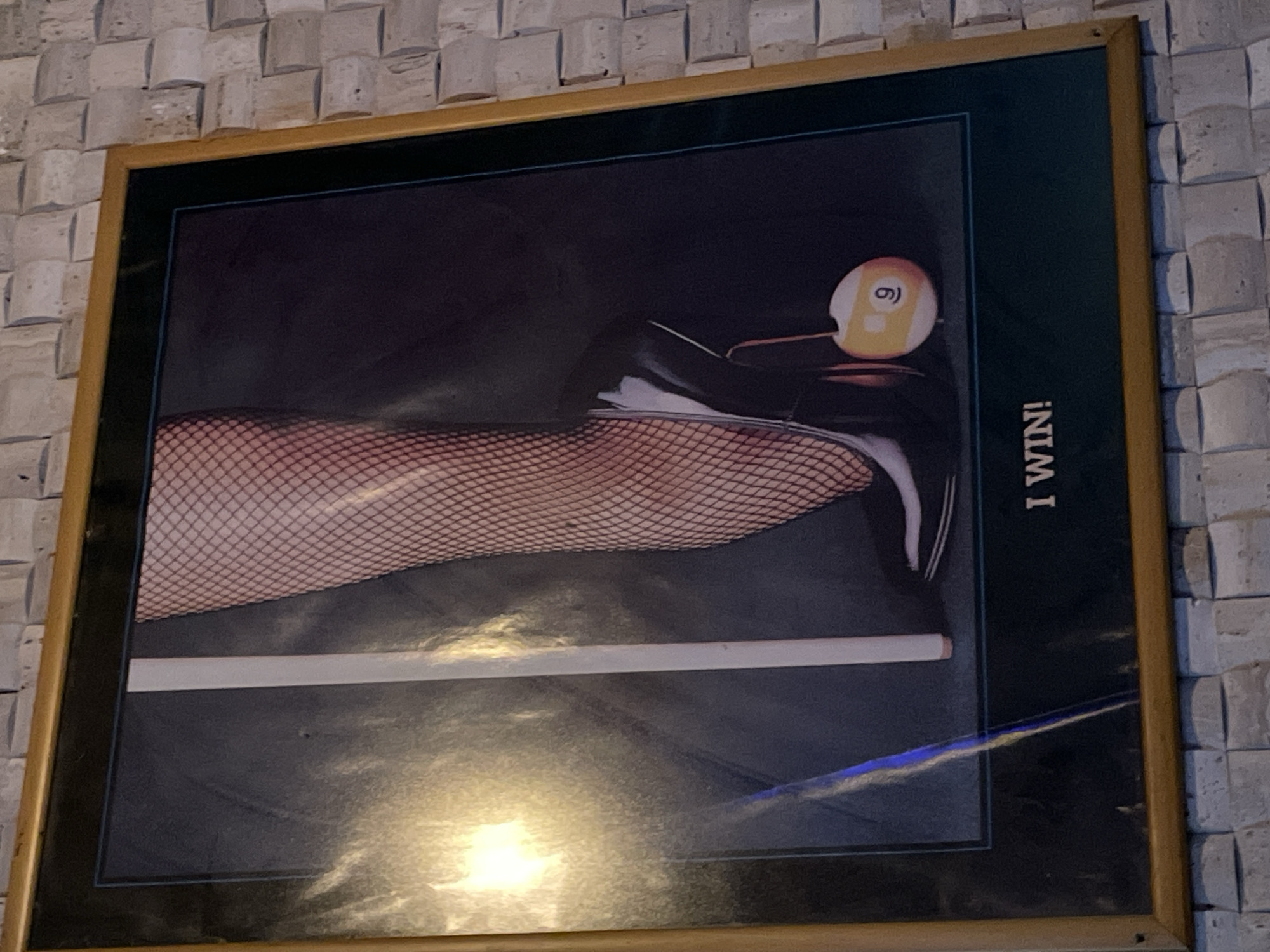 A framed poster hangs on a wall with textured stone-like blocks. The poster features a woman's leg in fishnet stockings and a high-heeled shoe resting on a pool cue. A yellow billiard ball with the number "9" on it is positioned near the shoe's heel. The phrase "I WIN!" is printed vertically on the right side of the poster. The poster is framed with a golden-brown border and hung on the wall. The location is not specified. Burgas, Bulgaria is not visible in the image.