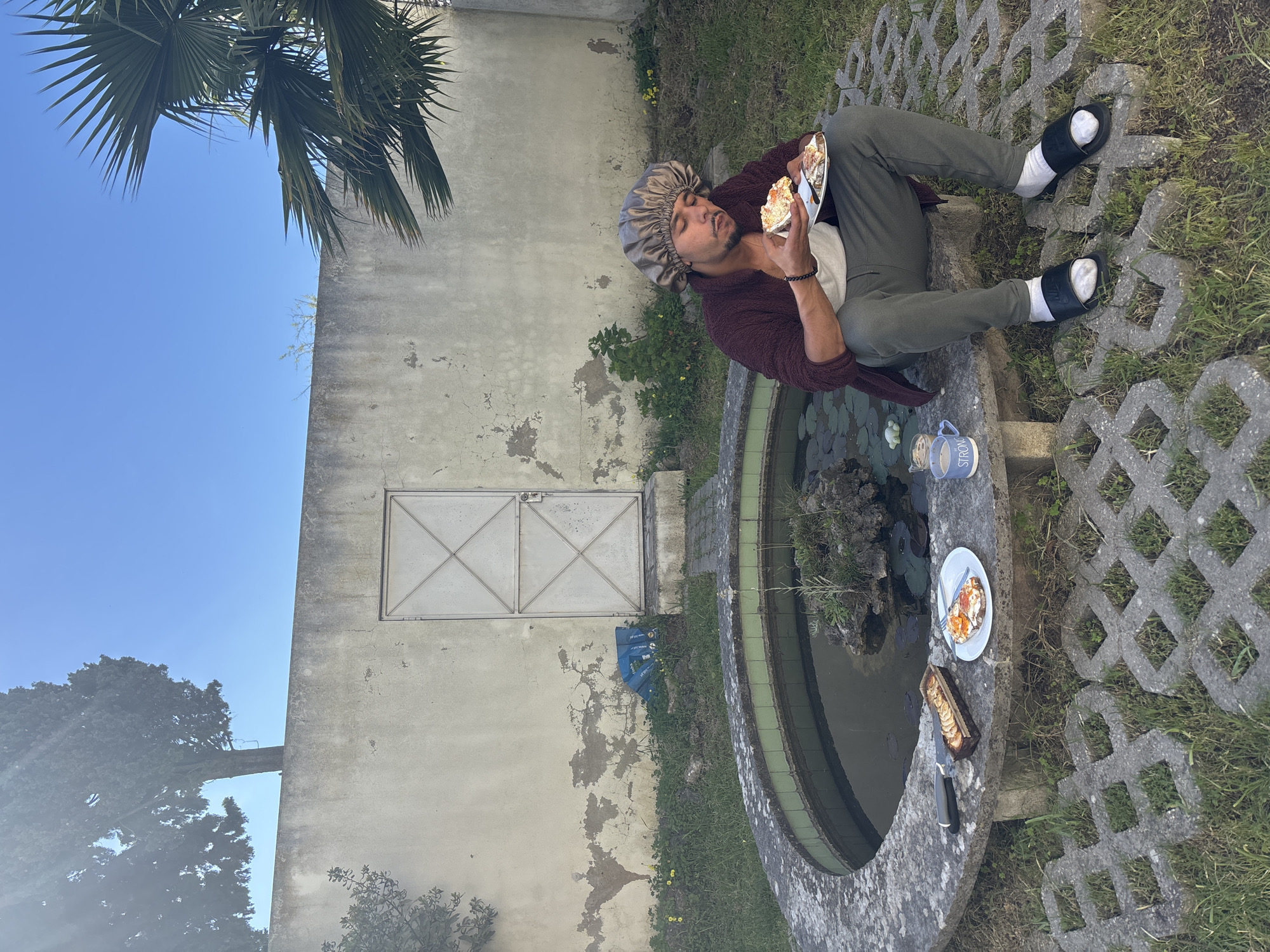 A man sits on the edge of a circular stone structure containing water and aquatic plants. He is eating food from a plate, wearing socks and sandals, a burgundy cardigan, and a shiny bonnet. On the edge of the structure is another plate of food, a loaf of bread, and two mugs. The structure is surrounded by a grass and concrete block surface. Behind the structure is an old, weathered building with a metal door. In the background, there are trees and a clear blue sky. The image was likely taken in Lisbon, Portugal, given the architectural style and vegetation.