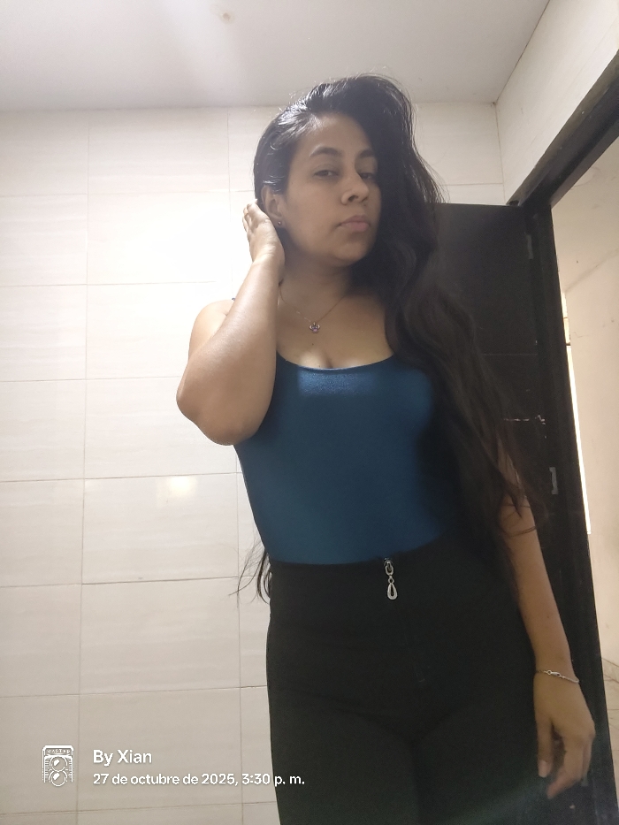 The image depicts a female individual posing for a photograph in an interior tiled space within the city of Cali, Colombia. The subject, a young adult woman, stands facing the camera with a neutral expression. She has long, dark, wavy hair, mostly parted to her left, cascading over her right shoulder and chest. Her right hand is raised, with fingers partially obscured by her hair, touching the side of her head near the ear. She wears a dark teal or blue spaghetti strap top and black high-waisted pants. A silver-colored necklace with a small, multi-faceted pendant is visible around her neck, and a thin, silver-colored chain-link bracelet adorns her left wrist. The black pants feature a prominent silver-colored zipper pull shaped like an inverted teardrop or pear at the center front waistband. The background consists of light-colored, possibly off-white or beige, square wall tiles arranged in a grid pattern. To the right, a dark vertical door frame or structural element is visible, suggesting an entryway or corner of a room. The lighting appears to be diffuse and originates from above or in front of the subject. A minor discoloration or smudge is present on the upper ceiling or wall section. A digital watermark in the lower left corner reads "By Xian" and "27 de octubre de 2025, 3:30 p. m." (October 27, 2025, 3:30 p.m.).