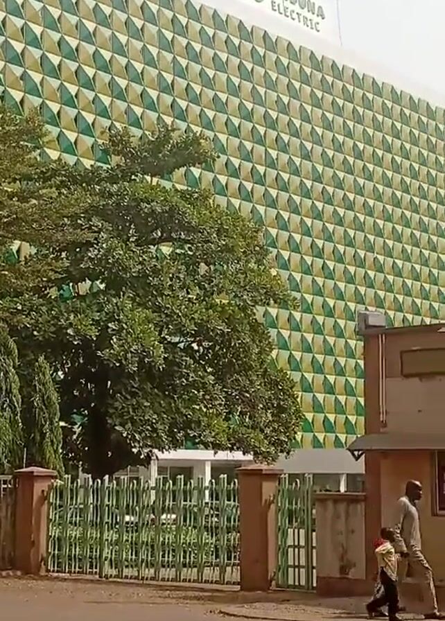 Kaduna Electric building, a large structure with a patterned facade of green and white geometric shapes
