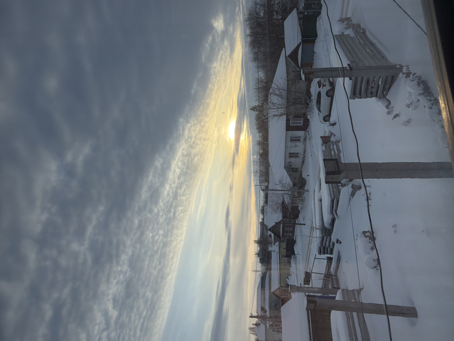 This image depicts a snow-covered residential street in Ershov, Russia, under a winter sky at what appears to be sunrise or sunset. The sun, a bright yellow-orange orb, is partially obscured by a low cloud band on the horizon, illuminating the clouds above it with warm hues while the upper sky is dominated by darker, textured clouds. In the foreground, the ground is covered in a thick layer of pristine white snow. Two concrete posts, part of a fence or boundary, are visible, with dark horizontal lines (likely power lines or cables) stretching between them and across the scene. Piles of building materials, including flat concrete slabs and possibly pipes, are also covered in snow to the left and right. The midground features a street and multiple detached houses, all with snow-laden roofs. Most houses are single-story; one prominent white house with a maroon door and white trim is visible on the right, in front of which a white SUV is parked, partially covered in snow. Other houses, varying in age and construction, are scattered throughout the neighborhood, including some older wooden structures. Bare trees and power poles with overhead lines are interspersed among the buildings. No individuals are visible. The background shows more distant buildings, a line of deciduous trees without leaves, and a faint industrial structure or tall antenna on the far left horizon, all under the muted light of the overcast winter sky. The scene is quiet and devoid of activity.