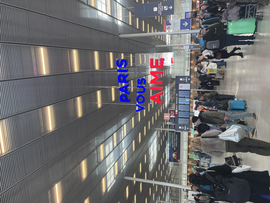 interior of Orly Airport in Paris, France. The coordinates provided correspond to the location of the airport. The ceiling is made of a metal grid with many lights, and the floor is tiled with a pattern of black and white squares. There are many people, most of whom are wearing casual clothes. Some are carrying luggage, while others are carrying backpacks or purses. The people are gathered in the departure area and are waiting to board their flights. There is a large sign above the crowd that reads "PARIS VOUS AIME" in French, meaning "Paris Loves You." In the background, there are various signs for different destinations and services, as well as a large screen displaying flight information. The environment is a bustling airport terminal, with a steady flow of people moving around. The image captures a moment of ordinary life in a busy airport, with people moving about and preparing for their journeys.
