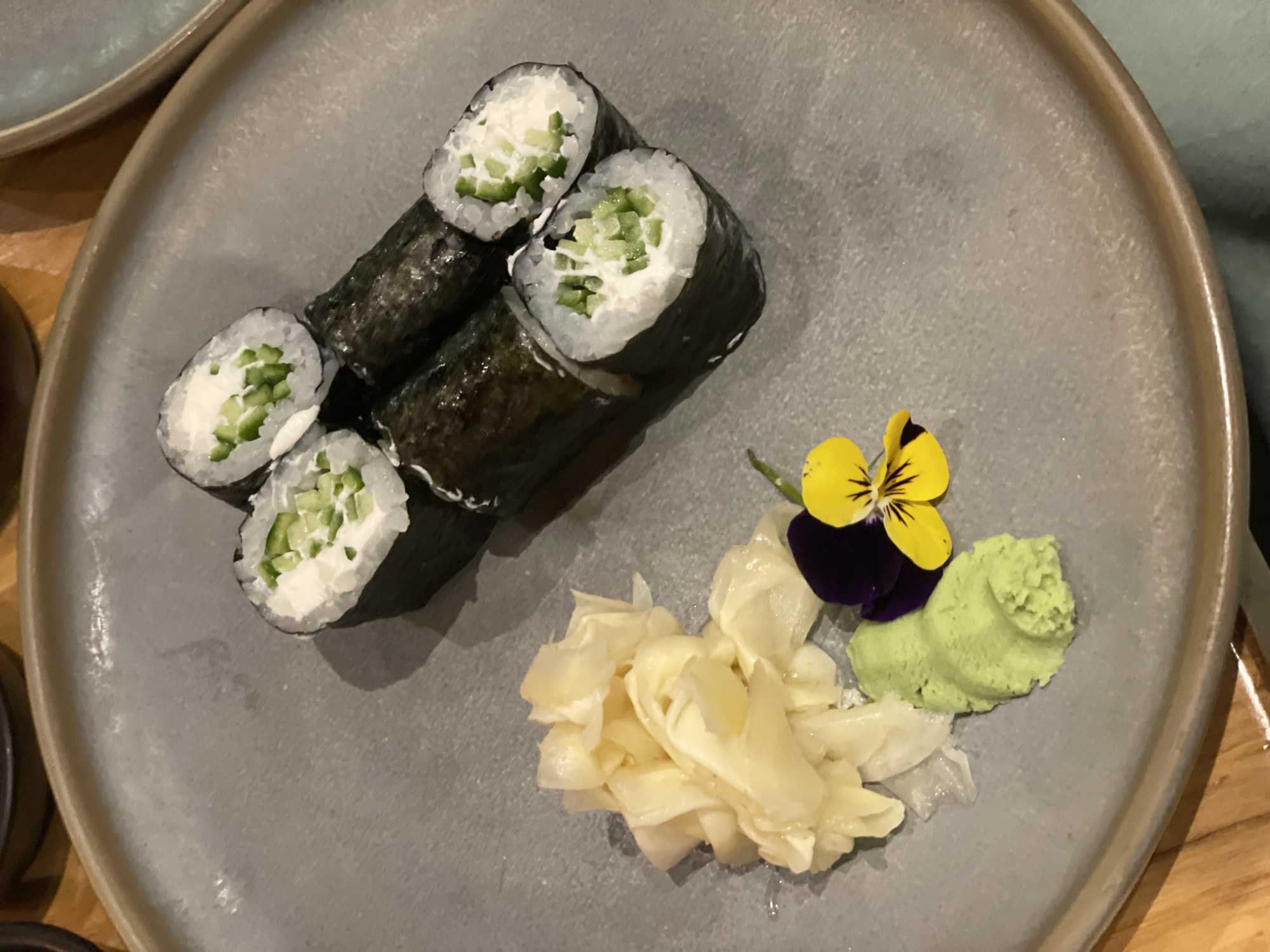 A plate of sushi is centered in the frame. The sushi consists of cucumber rolls wrapped in nori seaweed, arranged in two stacked rows of three rolls each. Next to the sushi rolls is a pile of pickled ginger, a dollop of wasabi, and a yellow and purple pansy flower. The plate is grey with a slightly raised edge. It is sitting on a wooden surface. The location is Raanana, Israel.