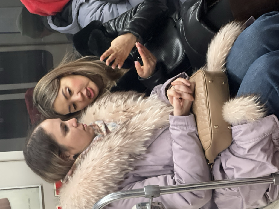 Two women sit on a train. One rests her head on the other’s fluffy fur collar and is mostly out of focus. The second woman wears a lavender jacket with a large fur collar and holds a beige quilted handbag. She has light brown hair. The woman sitting next to her wears a black jacket. Another person is in the background wearing a gray jacket and red hoodie. A metal bar of the train seat runs in front of the women.