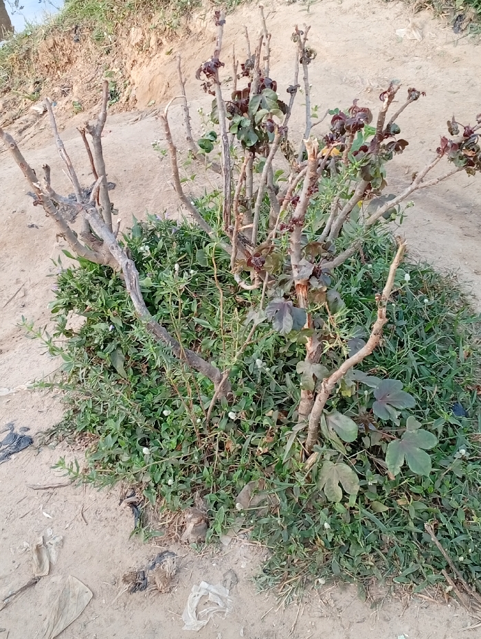 A scraggly bush with many bare, brown branches stands amidst green ground cover. Some branches have dark green and reddish leaves. The bush grows near a sandy path, littered with bits of plastic waste. A grassy bank rises behind the bush. The scene appears unkempt and neglected.