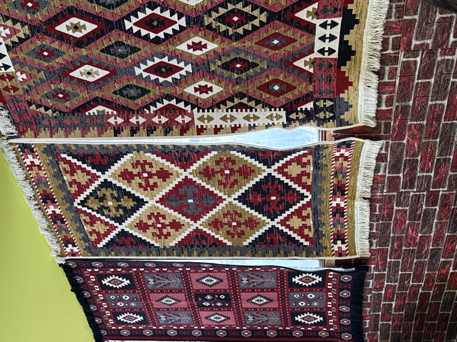 Three vertically suspended, woven rugs or kilims are displayed indoors in Borjomi, Georgia