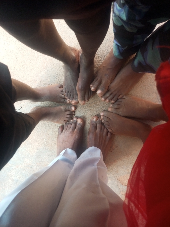 The scene depicts a top-down view of seven individuals' bare feet arranged in a radial pattern on a light-colored, textured ground surface in Tempure, Nigeria