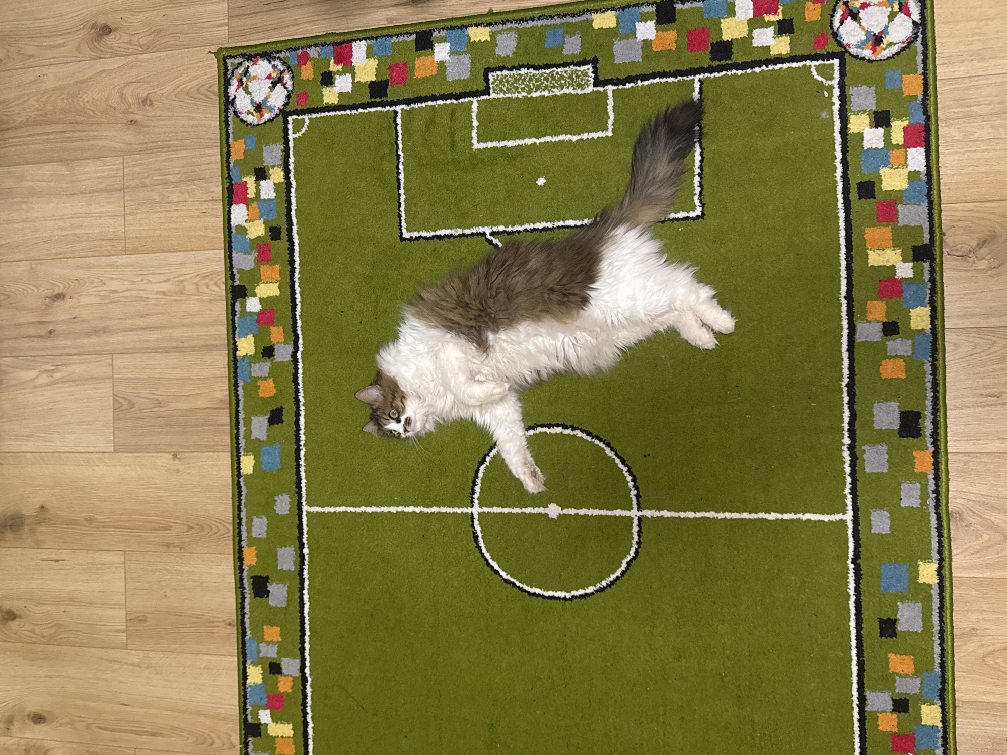 A high-angle, full shot depicts a long-haired, brown-and-white cat lounging on a green rug patterned after a soccer field. The rug features white boundary lines, goals, and a center circle. The rug's border is decorated with colorful square blocks and soccer balls. The rug rests on a wood floor. The location and city are not detectable from this image.