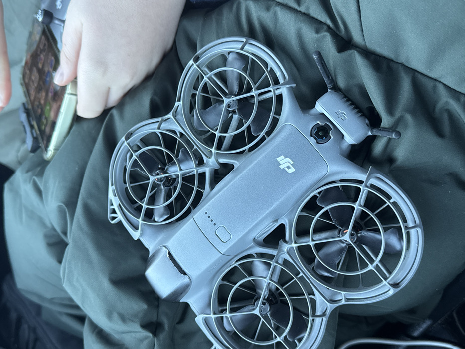 - "A grey DJI drone with attached propeller guards rests diagonally on a dark green quilted fabric surface" by FM-SHEMl1, licensed under CC BY 4.0