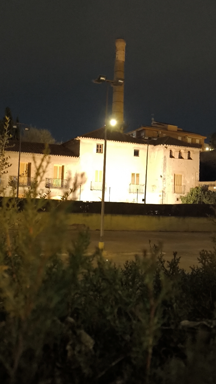 A three-story building is brightly lit against a dark night sky. The building features balconies with railings, and a red-tiled roof. An older building is visible behind it. A tall, cylindrical chimney-like structure stands in the background. A lamppost illuminates the scene with its bright light. Green bushes partially obscure the view.