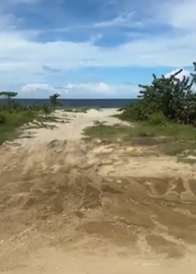 sandy road leading to a beach under a partly cloudy sky. The road is muddy in some areas and flanked by green vegetation on either side. In the distance, a small palm tree is visible. The ocean appears calm. There are no people or animals visible in the frame.