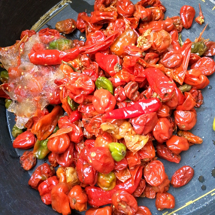 - "A close-up, top-down image depicts a collection of red, green, and orange-brown chili peppers contained within a dark, likely plastic, circular basin or bowl in the city of Bauchi, Nigeria" by FM-mz5r43, licensed under CC BY 4.0