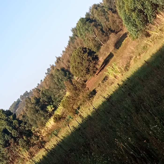 This diagonally oriented photograph depicts a sunlit rural landscape in Ndeiya, Kenya. The upper portion of the frame features a clear, light blue sky above a prominent, dense line of trees forming a natural boundary across a sloping terrain. Below the tree line, an unpaved dirt path traverses dry grassy areas with scattered smaller vegetation. A distinct, elongated human-shaped shadow is cast diagonally across the path and surrounding ground, originating from an unseen source outside the frame to the right. A section of taller, light green vegetation is situated to the right of the path. The foreground comprises an expanse of mixed green and brown low-lying vegetation, partially obscured by a sharp diagonal shadow line. No individuals or specific man-made objects are directly observed within the frame. The low-angle sunlight creating prominent shadows suggests either early morning or late afternoon conditions.