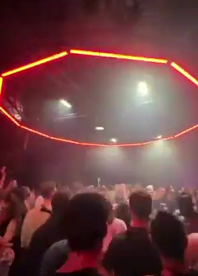 A crowded dance floor is visible, with people mostly facing toward an unseen source