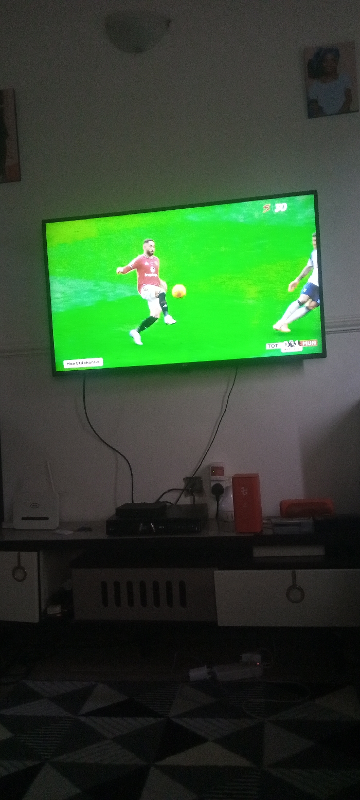 This image depicts an indoor residential living area in Sabon Tasha, Nigeria. A wall-mounted flat-screen television centrally displays a football (soccer) match. A player in a red Manchester United jersey is visible, controlling a yellow ball, with a partial view of an opposing player in a white and blue jersey on the right side of the screen. On-screen graphics indicate "S 3D" in the upper right and "TOT" versus "MUN" with a Premier League logo in the lower right, along with "Man Utd chantos" in the lower left. Below the television, a dark media console is populated with electronic devices. From left to right on its surface, these include a white Intel-branded internet router with an antenna, several stacked dark electronic components (likely set-top boxes or media players), a white power adapter plugged into a wall outlet, an orange cylindrical device, and a red rectangular object. Numerous black cables descend from the television and connect to the devices on the console. The console itself has a white drawer on the left and a section with vertical ventilation slats in the center. The light-colored wall features two framed pictures: a partially visible dark vertical image on the upper left, and a portrait of a person in a light-colored top on the upper right. A circular, domed light fixture is visible on the ceiling. The floor is covered by a geometrically patterned rug featuring black, grey, and white triangles.