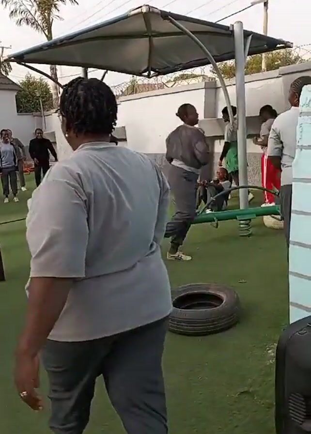 group of adults and children playing in a playground. The ground is covered in green artificial turf. There is a metal structure with a canopy roof. Some people are running and jumping over a rope. One person is on a seesaw. There are several tires lying on the ground. A tall palm tree is visible in the background.