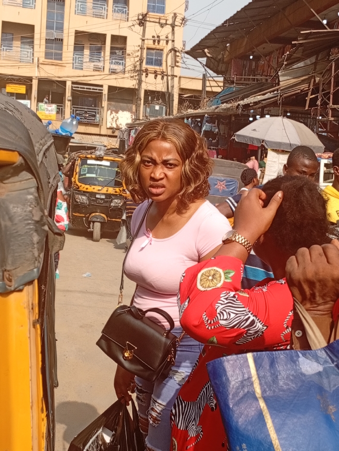This image depicts a busy urban street scene in Fegge, Nigeria, during daylight. In the foreground, a woman with shoulder-length wavy brown hair, wearing a pink short-sleeved top and ripped light blue jeans, stands with a stern or displeased expression, looking directly at the camera with furrowed brows and partially bared teeth. She carries a black shoulder bag with a gold clasp slung across her body and holds black plastic bags in her left hand. To her immediate right, another woman is partially visible, wearing a red long-sleeved top adorned with white and black zebra stripes and yellow lemon slice motifs. Her right hand is raised to her head, appearing to adjust her hair or a wig, and a gold-colored watch is visible on her left wrist. She holds a large blue bag with her left hand. Behind these two women, a man in a yellow shirt is partially visible, along with other indistinct individuals in the background. In the mid-ground, a yellow and black auto-rickshaw (keke Napep) is visible. The background features a multi-story, light-colored building with multiple windows and balconies, indicative of commercial or residential use. To the right, various market stalls with corrugated metal roofs and a white umbrella suggest an active market area. Numerous overhead power lines and utility poles are visible throughout the scene. The ground surface appears to be unpaved or dusty.