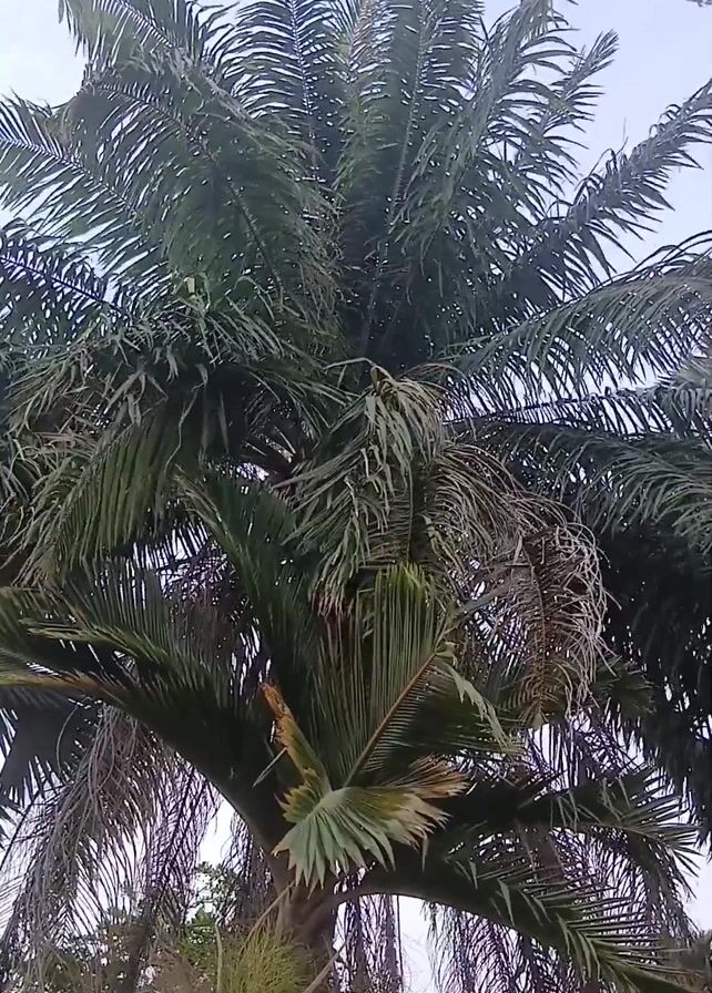 view looking up at several palm trees against a light blue sky. The palm trees have long, green fronds that sway slightly. The bark of the palm tree is visible. Other trees and vegetation can be seen in the background.