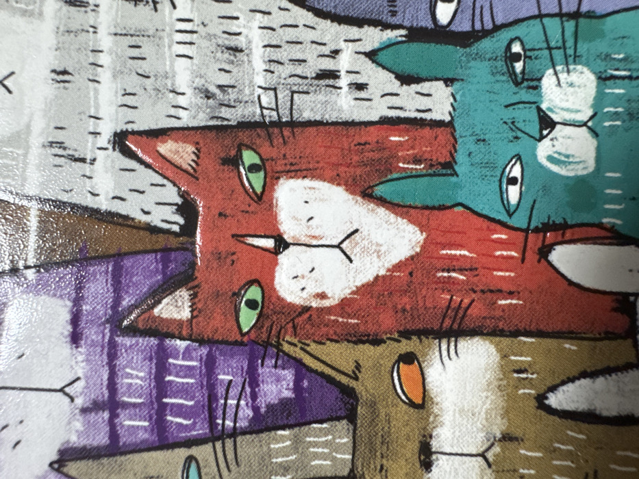 A patterned image displays several stylized cats