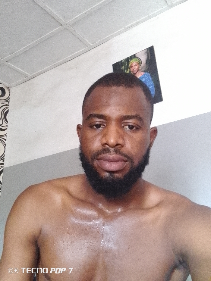 The scene is an interior room within the city of Zango-ndaji, Nigeria. An adult male subject, of apparent African ethnicity, is depicted from the chest up, facing and looking directly into the camera. He has short, dark, closely cropped hair and a full dark beard. His bare chest and shoulders exhibit a glistening sheen. The background features a white ceiling constructed from square panels. The wall behind the subject is horizontally bisected: the upper section is white, and the lower section is a light grey. A framed photographic portrait of a woman, wearing a headscarf and patterned blue attire, is mounted on the upper white wall section to the subject's right. To the subject's left, a segment of wallpaper displays a black and white abstract pattern of concentric swirling designs. The image bears a "TECNO POP 7" watermark in the lower left corner.