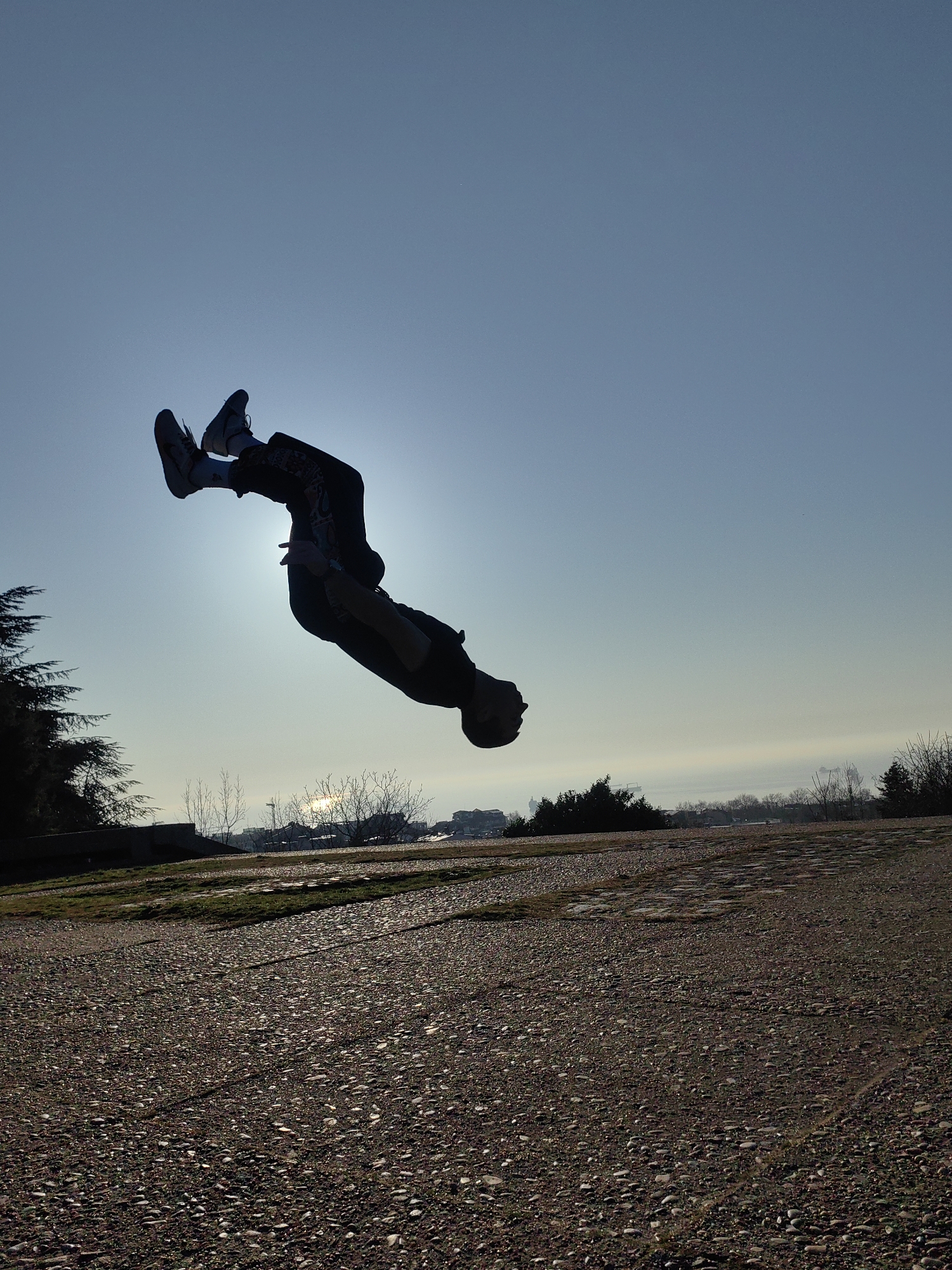 - "An outdoor, daytime image captures a silhouetted individual mid-air, performing an acrobatic flip against a bright, clear light-blue sky" by FM-Uf5wv1, licensed under CC BY 4.0